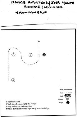 Lead your horse in a set pattern designed by the judge including walk, jog, stops, turns and back up, Performed individually and then line up in the ring all together.